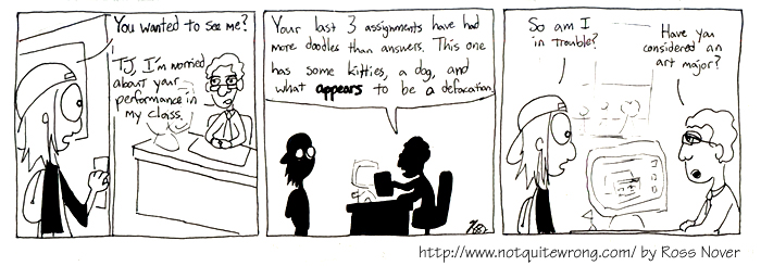 This is a true story, though in another direction. I was a graphic design major in college, and one of my more interesting teachers once told a girl in a critique of her work, "I'm thinking, try a business major."