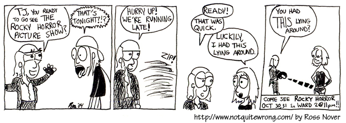 I have been attending Rocky Horror since I was 16 or so. I love it. I started up a troop in DC called Androids Fighting, and we sold out for Halloween. When it came to advertising, I couldn't resist the urge to plug my own event in my own comic. I'm sneaky. |