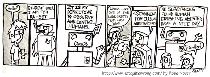 SO I had this great idea about working a robot into the cast. I mean, it went so well with the pirate, I thought it would work with him too. It didn't, so I stopped it. The idea for 'Ladner-bots' is hard to talk about, but it was based around the president of my school, AU, who had a reputation for making WAYYYY too much money so he built an army of robots. |