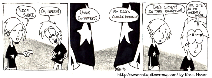 Another true story. I try to steal as much clothes from my dad's closet and my grandfather's closet as I can because it is LIKE faux-vintage, only ACTUALLY vintage. Now there's a novel concept. I had on a sweatshirt that my dad got 25 years ago, and this guy in a new t-shirt from Urban Outfitters has the same design on it. Mine was free, his was 40 bucks. I win. |