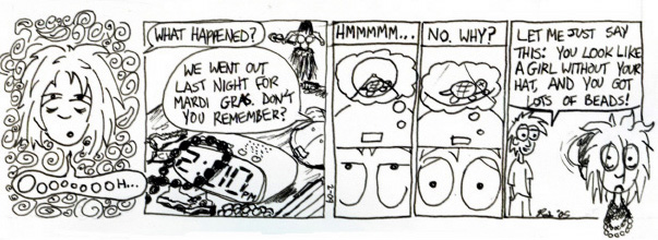 A quick storyline about Mardi Gras, roughly based on my friend TJ. You see, TJ is originally based on a good friend of mine, who is also the co-author of a story I'm working on called "Wonder Steve and the Rockets" which I'm sure I'll mention more about later. Meanwhile, read this stuff.